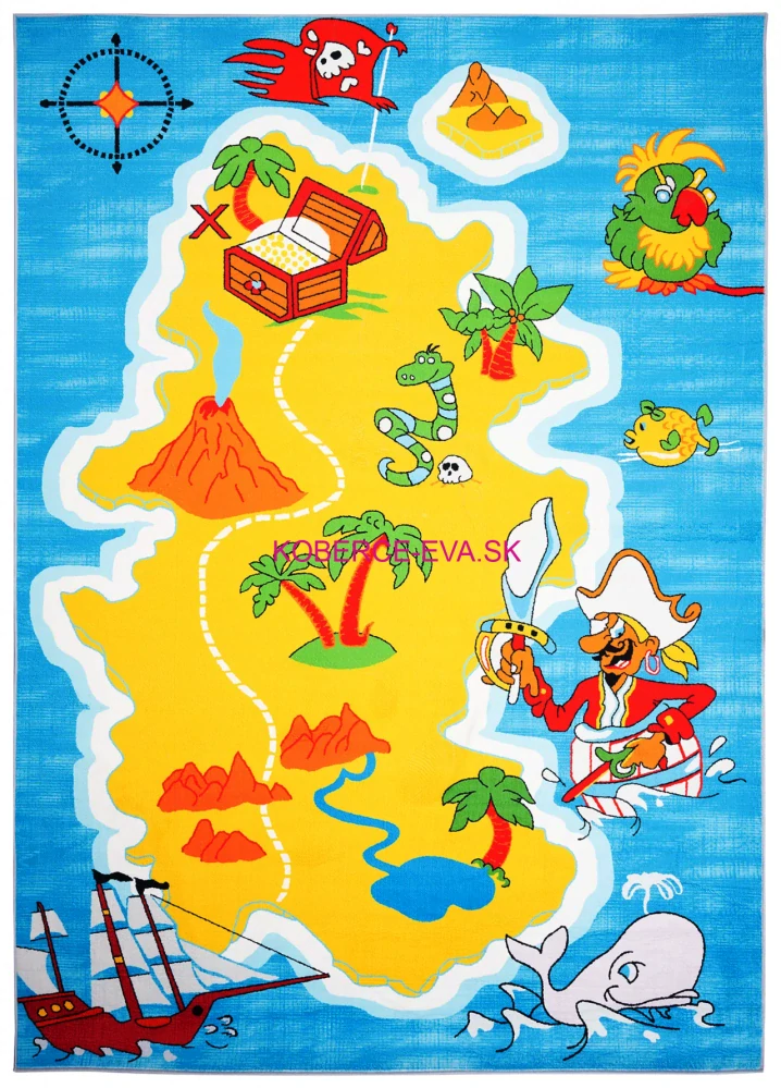 Detský koberec na hranie s potlačou ostrova je ako stvorený pre detskú izbu, vyrába sa z materiálu 100% Polyester na protišmykovej podložke s chemlonovým obšitím po celom obvode koberca a celkovou výškou 7mm, koberec má krátky vlas a jednoducho sa čistí.